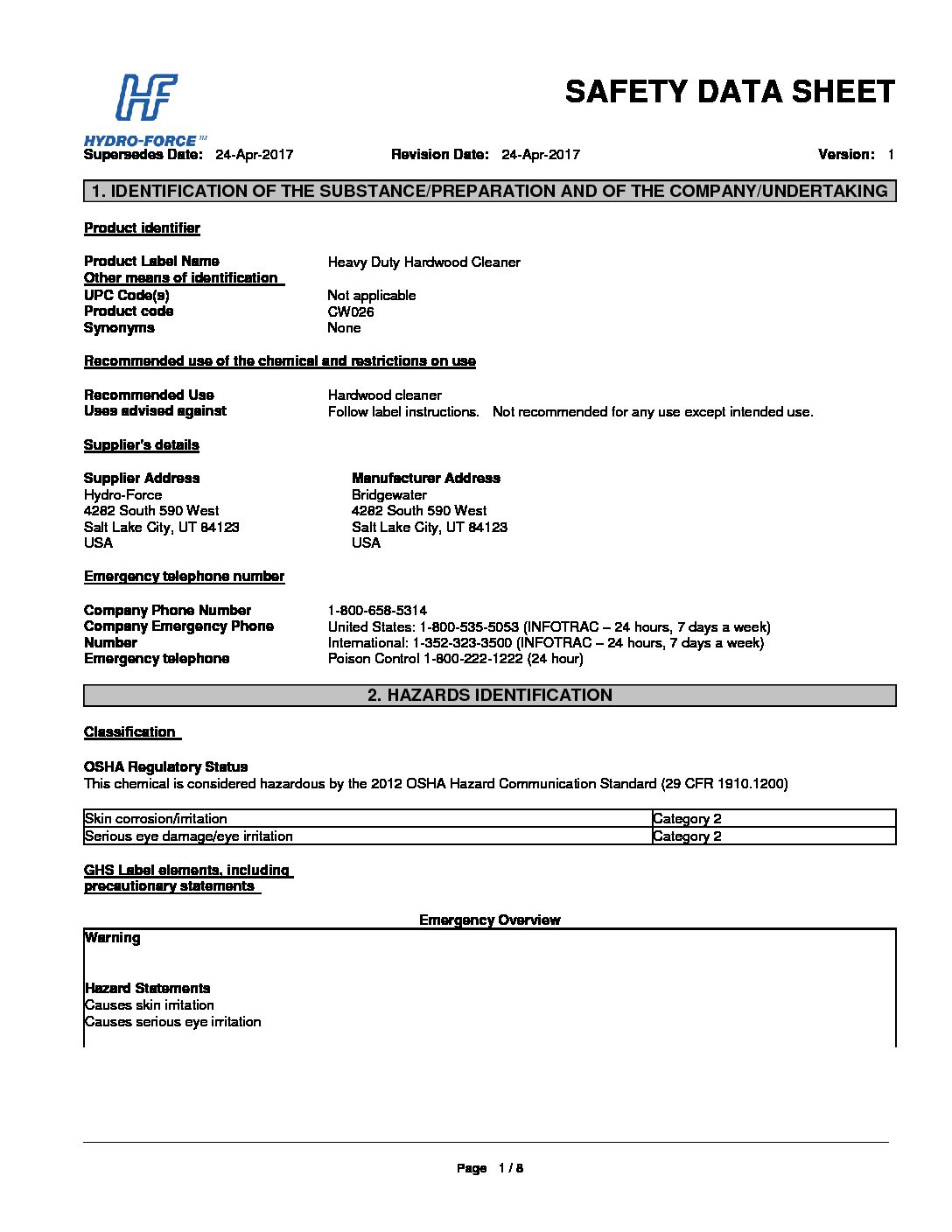 - Must be neutralized by a follow-up extraction with Hydro-Force Wood Fresh Hardwood Cleaner